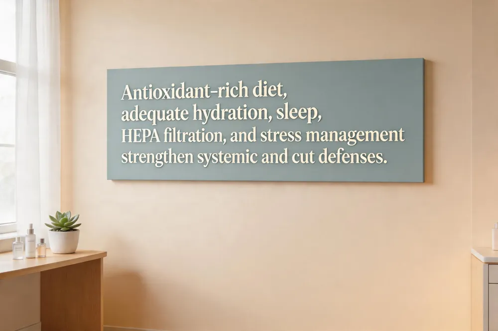A diet rich in antioxidants—berries, leafy greens, nuts, and citrus—provides vitamins C and E, polyphenols, and omega‑3s that neutralize free radicals generated by urban pollutants and support collagen integrity. Adequate hydration and 6‑7 hours of quality sleep each night restore the skin barrier, reduce transepidermal water loss, and enhance cellular repair processes. Using HEPA‑rated air purifiers and humidifiers in home and office lowers airborne particulate matter and maintains optimal skin moisture, preventing dryness and irritation. Regular moderate exercise improves circulation and lung function, aiding systemic detoxification, while stress‑management techniques such as mindfulness, yoga, or adequate rest lower cortisol levels that can exacerbate barrier disruption and acne. To counter pollution‑related skin damage, cleanse the face nightly with a gentle, alcohol‑free cleanser, then apply an antioxidant serum (vitamin C, niacinamide, green‑tea extract) and a fragrance‑free, ceramide‑rich moisturizer while the skin is still damp. Finish with a broad‑spectrum sunscreen SPF 30 + to shield against UV‑induced oxidative stress. Protecting the skin also includes physical barriers: wide‑brimmed hats, UV‑blocking sunglasses, and breathable clothing that limit particulate deposition. Together, these lifestyle, nutritional, and indoor‑air strategies create a comprehensive defense against the cumulative assaults of urban pollution on skin health.