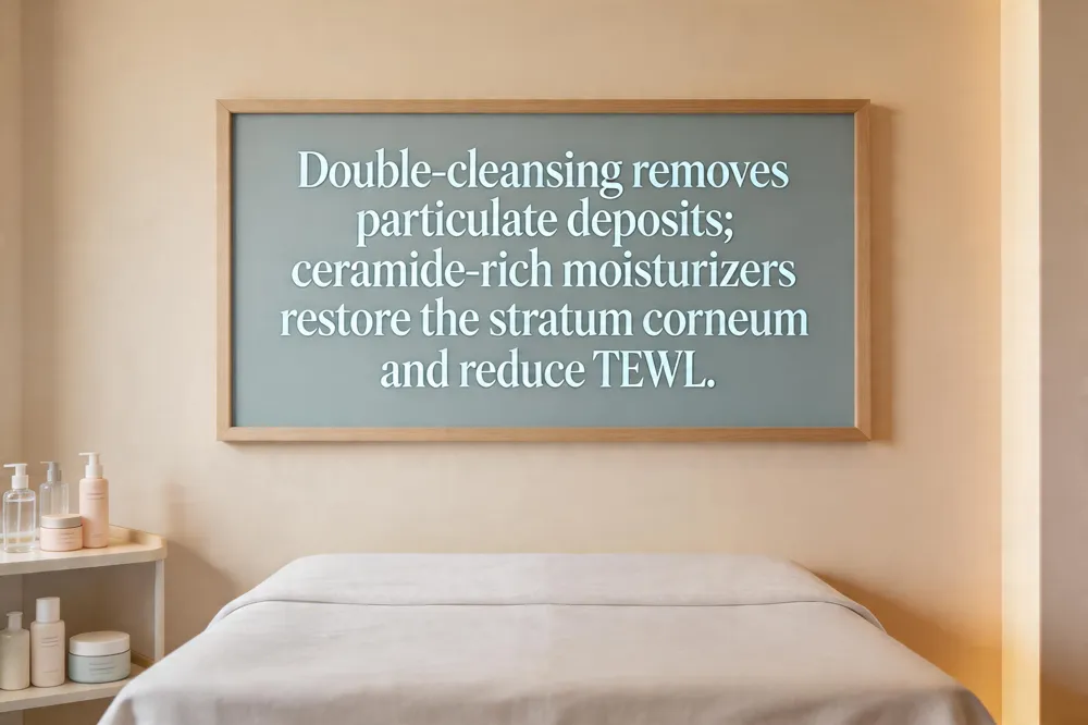 Urban air pollutants settle on the skin, so a robust cleansing and barrier‑repair routine is essential. A double‑cleansing protocol—first an oil‑based cleanser to dissolve oil‑soluble grime, then a gentle water‑based cleanser—removes both makeup and particulate matter without stripping lipids. For oily skin, AHA/BHA‑based cleansers exfoliate dead cells and clear clogged pores, while soap‑free formulas enriched with hyaluronic acid keep the barrier intact for sensitive or dry types. After cleansing, apply a fragrance‑free moisturizer packed with ceramides and hyaluronic acid; these lipids and humectants rebuild the stratum corneum, reduce transepidermal water loss, and block pollutant penetration.