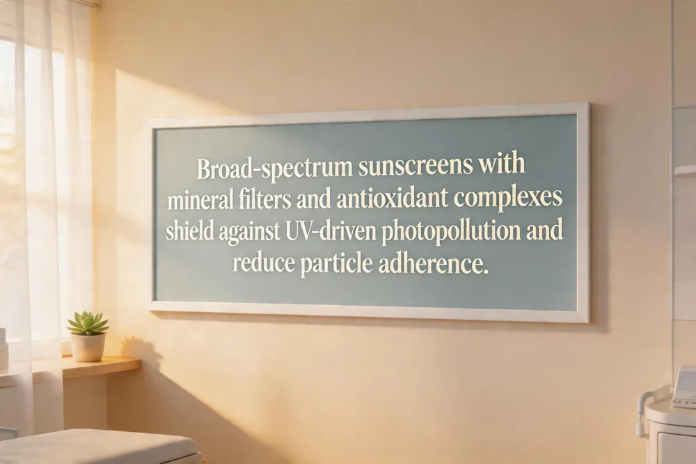 Broad‑spectrum sunscreens of SPF 30 or higher—especially those formulated with mineral filters such as zinc oxide or titanium dioxide—provide a physical shield against UVA and UVB rays while also reducing the adherence of airborne particles to the skin surface. Modern anti‑pollution sunscreen blends add antioxidant complexes (e.g., alpine sanicle, blackcurrant, green tea polyphenols) that scavenge free radicals generated by ozone and particulate matter, creating a dual‑defense against "photopollution"—the synergistic damage caused when UV radiation activates pollutants like PAHs.
