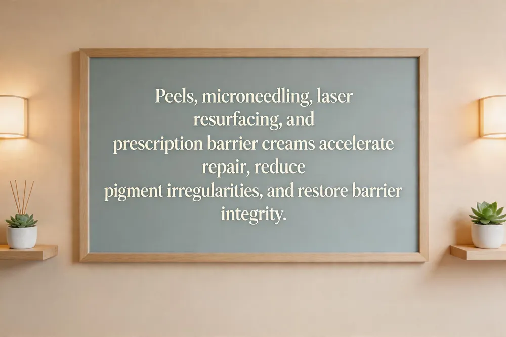 Urban pollutants accelerate oxidative stress, collagen breakdown and barrier disruption. Peels and microneedling remove pollutant‑laden dead cells, stimulate repair and boost collagen, while laser resurfacing targets pigment irregularities from PAH‑induced melanin overproduction. Prescription barrier‑repair creams with ceramides, fatty acids and niacinamide restore the stratum corneum, reduce transepidermal water loss and limit pollutant penetration. Clinical guidance recommends a regimen: cleanse, antioxidant serum (vitamin C, green tea), barrier‑repair moisturizer, SPF 30‑50, plus peels, microneedling or laser sessions needed.