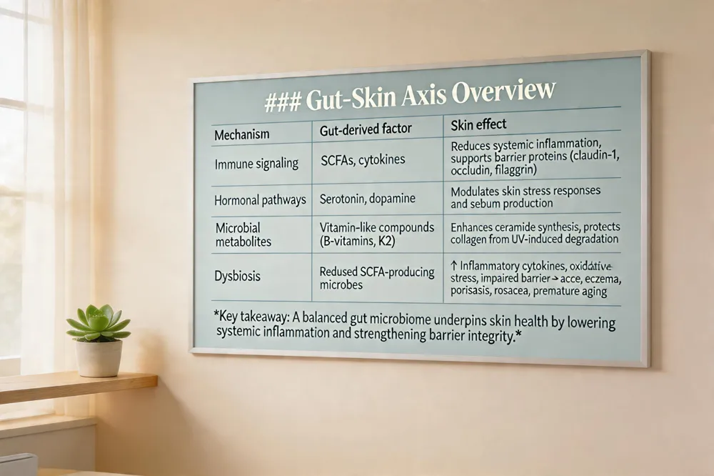 Key takeaway: A balanced gut microbiome underpins skin health by lowering systemic inflammation and strengthening barrier integrity.