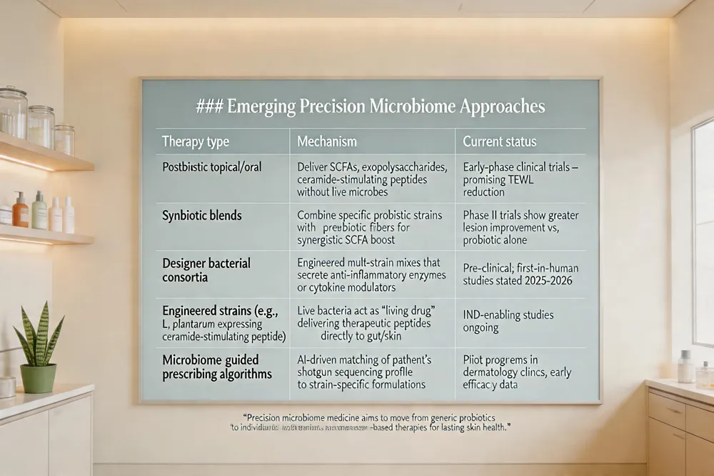 | Postbiotic topical/oral | Deliver SCFAs, exopolysaccharides, ceramide‑stimulating peptides without live microbes | Early‑phase clinical trials – promising TEWL reduction |