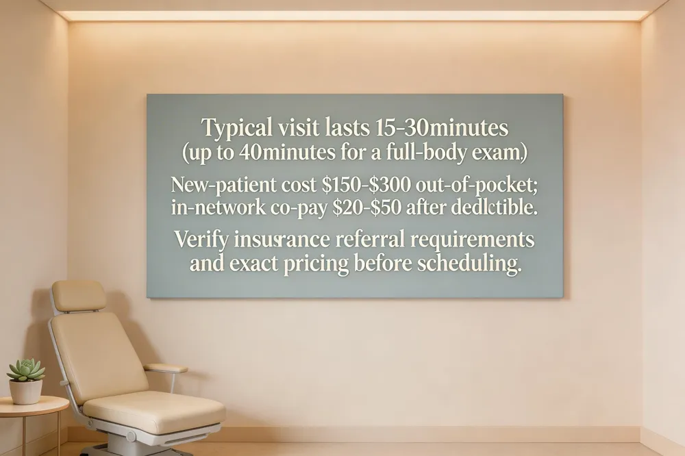 Cost for a new‑patient visit ranges from $150 to $300 out‑of‑pocket, with some Chicago‑suburban practices reporting $145‑$336. If you have insurance and have met your deductible, co‑pays are usually $20‑$50 for in‑network providers. Fees may vary by location, dermatologist experience, and any extra services such as biopsies or lab tests. Call the office ahead to confirm exact pricing and ask about discounts for uninsured patients.