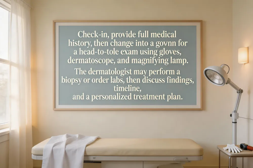 What to expect at your first dermatologist appointment for skin cancer? The dermatologist screens the entire skin surface, uses a dermatoscope for suspicious spots, may perform a same‑day biopsy, and then provides risk‑based counseling, sun‑protection strategies, and a monitoring plan.