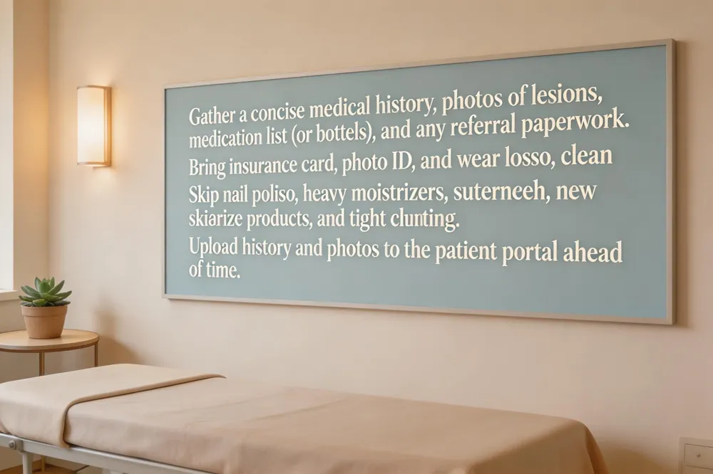A successful first visit starts with a solid pre‑appointment checklist. Gather a concise medical history—including past skin conditions, surgeries, current prescriptions, OTC products, supplements, and any allergies. Bring clear photos of concerning spots or past flare‑ups, and write down two‑to‑three priority concerns with details such as onset, triggers, and previous treatments. Pack your insurance card, photo ID, and any referral paperwork the practice may request.