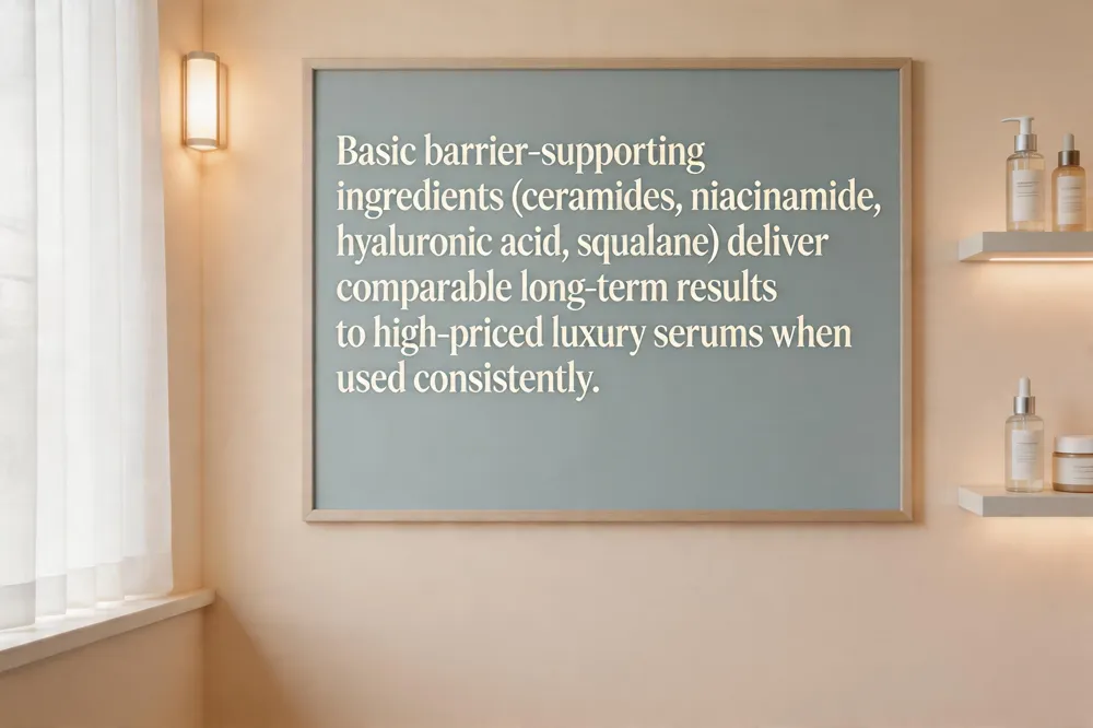 Luxury skincare often markets cutting‑edge actives, but evidence shows that consistent use of basic, barrier‑supporting ingredients—ceramides, niacinamide, hyaluronic acid, and squalane—delivers comparable long‑term results to high‑priced formulas. Clinical trials repeatedly demonstrate that a simple three‑step routine (gentle cleanser, moisturizer, SPF 30+ sunscreen) improves hydration, reduces transepidermal water loss, and lowers photo‑aging risk more reliably than sporadic use of luxury serums. The cost‑benefit analysis is clear: a basic regimen costs $15‑$25 per month and achieves barrier repair and antioxidant protection, whereas many luxury lines exceed $150 per month without proven superiority.