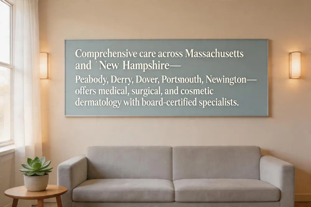 Peabody, Massachusetts is served by Dermatology & Skin Health (23 Centennial Dr.). Board‑certified providers—Dr. Gary Mendese, DO Robert Murgia III, PA‑C Michelle Ryder—treat acne, eczema, skin cancer, hair loss and vascular lesions. Services include Mohs micrographic surgery, cryotherapy, laser therapy and cosmetic procedures such as photodynamic treatment. Hours: Mon‑Fri 8 a.m.–4:30 p.m. (Wed 7:30 a.m. start). Appointments: (978) 525‑0100 or online portal.