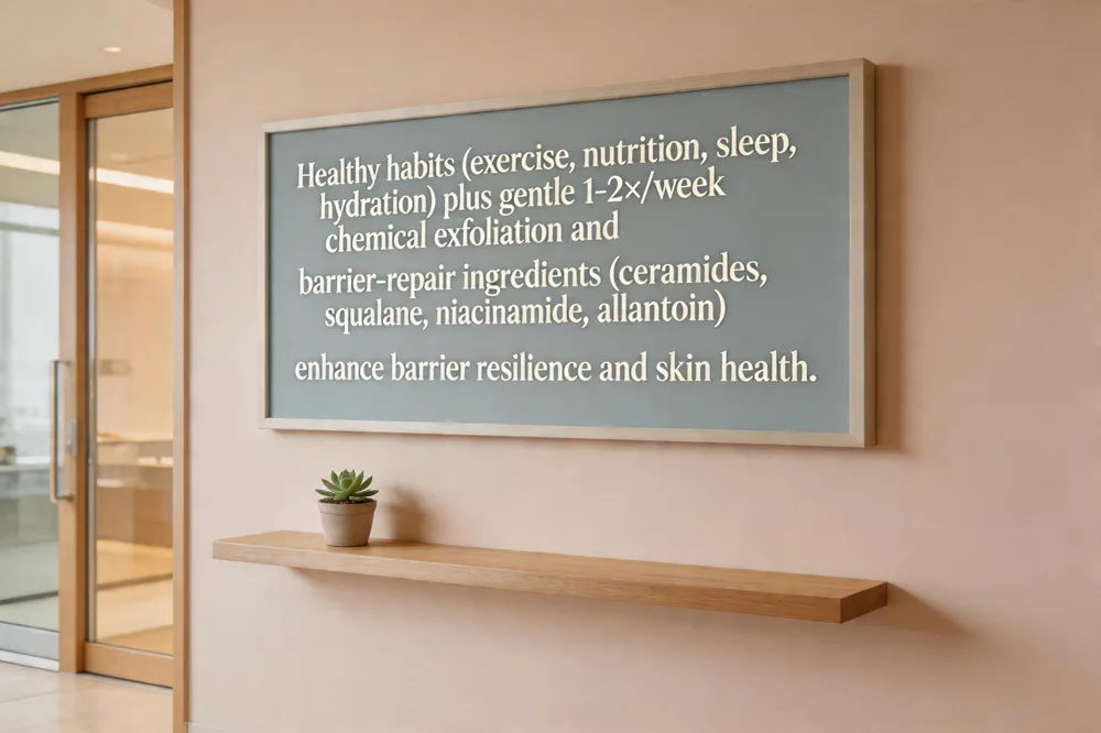 A healthy skin barrier is the foundation of clear, youthful skin, and its resilience is driven by both external care and internal habits. Consistent lifestyle factors—regular exercise, antioxidant‑rich nutrition, adequate sleep, and hydration—directly boost barrier function and reduce inflammation, complementing topical products. Exfoliation should be gentle and controlled: 1‑2 times per week with chemical exfoliants such as polyhydroxy acids (PHAs) or mild AHAs, avoiding over‑exfoliation that can strip lipids and impair the barrier. Barrier‑supporting ingredients like ceramides, squalane, niacinamide, and allantoin replenish lipids, lock in moisture, and calm irritation, making them ideal for daily moisturizers and night creams. Turning skincare into a ritual—morning cleanse, antioxidant serum, moisturizer, and sunscreen followed by nighttime cleanse, treatment, and barrier‑repair cream—creates habit strength, improves adherence, and aligns product application with the skin’s 28‑day renewal cycle. This simple, evidence‑based routine delivers measurable improvements in hydration, texture, and long‑term skin health without the need for expensive, high‑step regimens.