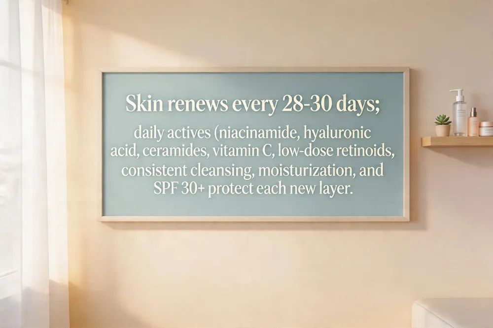 Human skin undergos a cellular turnover cycle of roughly 28‑30 days, during which new keratinocytes migrate outward to replace the stratum corneum. This natural rhythm means that active ingredients—such as niacinamide, hyaluronic acid, ceramides, vitamin C, and low‑dose retinoids—must be present on a daily basis to influence each new layer as it forms. Consistent cleansing prepares the barrier, while regular moisturization (ide with barrier‑supporting agents like squalane or ceramides restores lipid balance and reduces transepidermal water loss. Broad‑spectrum SPF 30+ sunscreen applied each morning shields the renewing epidermis from UV‑induced collagen breakdown and oxidative stress.