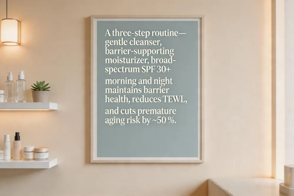 A simple three‑step routine—gentle cleanser, hydrating moisturizer, and broad‑spectrum sunscreen—forms the foundation of evidence‑based skin care. The American Academy of Dermatology (AAD) recommends using these three products both morning and night to maintain a healthy skin barrier, control oil, and protect against UV‑induced damage. Consistent cleansing removes dirt, oil, and pollutants without stripping the skin, while a moisturizer applied within minutes of washing locks in lipids and reduces transepidermal water loss, strengthening the barrier. Daily sunscreen (SPF 30 or higher) is the single most effective anti‑aging intervention, cutting the risk of premature aging and skin cancer by up to 50 % compared with intermittent use. By aligning product application with the skin’s 28‑day renewal cycle, this routine supports continuous repair, improves hydration, and reduces irritation—delivering measurable improvements in texture and tone without the need for expensive, multi‑step regimens.