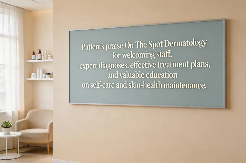Patients consistently highlight the welcoming atmosphere and attentive staff at On The Spot Dermatology, noting that they feel genuinely cared for from the moment they walk in. Reviews praise the clinicians’ expertise, swift diagnoses, and effective treatment plans that quickly improve conditions such as acne, skin cancer screenings, and cosmetic concerns. The practice’s modern, clean facilities and seamless appointment scheduling receive frequent commendations. Many testimonials emphasize the valuable education provided on self‑detection and ongoing skin‑health maintenance. Overall, the combination of personalized care, professional expertise, and a friendly environment leads to high satisfaction and repeat visits.