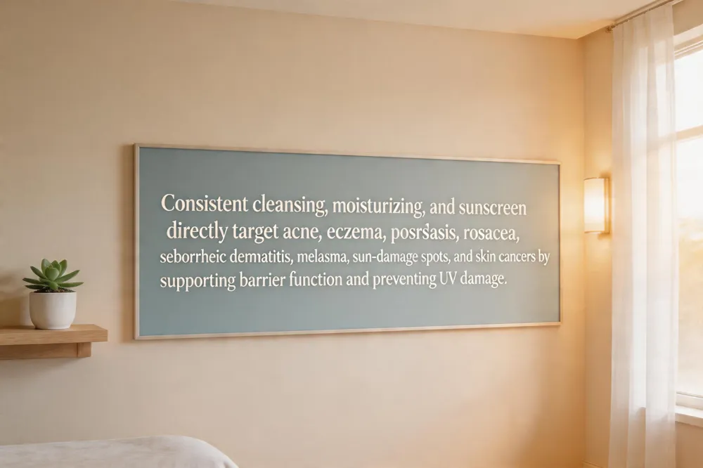 A simple, evidence‑based routine—gentle twice‑daily cleansing, a barrier‑supporting moisturizer containing ingredients such as niacinamide, ceramides, or hyaluronic acid, and broad‑spectrum SPF 30+ sunscreen—directly addresses the underlying factors of these conditions.