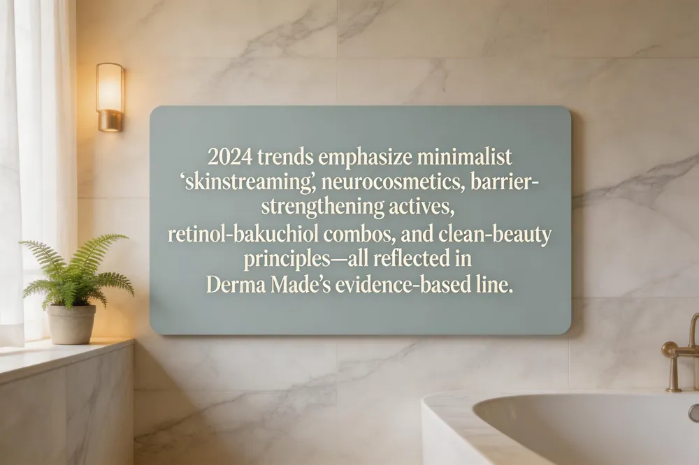 In 2024 consumers are gravitating toward minimalist “skinstreaming” routines that rely on a few high‑efficacy products rather than layered, potentially irritating regimens. Neurocosmetics—formulas enriched with calming actives such as ectoin, magnesium, and botanical extracts—aim to soothe the skin’s nervous system, reducing stress‑related flare‑ups. Barrier‑strengthening actives, especially ceramides, hyaluronic acid, and omega‑fatty acids, dominate product lines, reflecting a shift toward restoring the skin’s natural defense and minimizing transepidermal water loss. Classic retinol is being reformulated into “super‑charged” versions that pair retinol with bakuchiol, peptides, or encapsulated delivery systems to boost collagen synthesis while cutting dryness and irritation. Clean‑beauty principles—fragrance‑free, paraben‑free, cruelty‑free, and sustainably packaged—are now paired with whole‑body care, encouraging patients to treat the skin as an integrated system rather than isolated facial concerns. Brands such as Derma Made exemplify these trends by offering evidence‑based, barrier‑repair moisturizers, antioxidant vitamin C serums, and dermatologist‑approved retinol‑bakuchiol blends that align with the modern, holistic approach to skin health.