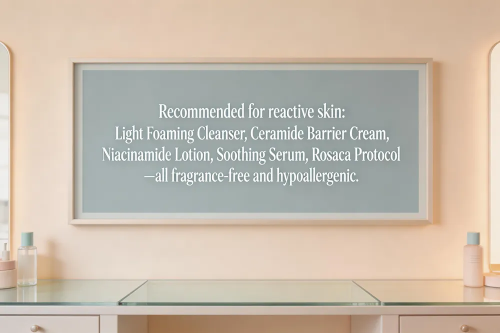Which Derma Made skincare products are recommended for sensitive skin? For sensitive skin, Derma Made recommends the Light Foaming Cleanser, a gentle, fragrance‑free foaming wash that cleans without stripping the barrier. Their Niacinamide Lotion and Ceramide Barrier Cream are both hypoallergenic moisturizers fortified with barrier‑supportive ingredients to soothe and hydrate delicate skin. The Niacinamide‑rich Soothing Serum further calms irritation while providing antioxidant protection. The Rosacea Protocol, which includes the soothing serum and barrier‑repair cream, is specifically formulated for inflamed, sensitive skin. All of these products are free of harsh fragrances and designed to be non‑comedogenic and suitable for the most reactive skin types.