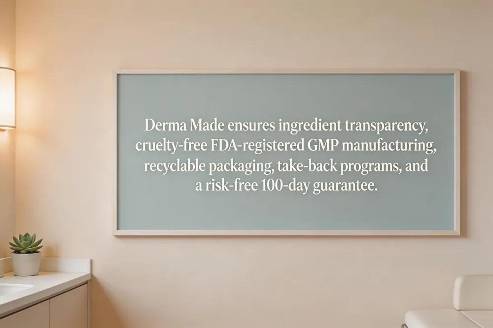 Derma Made places transparency at the core of its brand philosophy. Every product label lists active ingredients and their concentrations, allowing patients and clinicians to verify the science‑backed actives such as ceramides, hyaluronic acid, and tranexamic acid. All formulations are cruelty‑free, manufactured in FDA‑registered facilities that follow Good Manufacturing Practices and never test on animals. Packaging is designed for environmental responsibility—bottles and tubes are recyclable, and the company participates in take‑back programs to reduce waste. Confidence in efficacy is reinforced by a 100‑day full money‑back guarantee, letting users trial the products risk‑free.