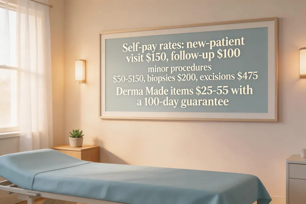 OnSpot Dermatology’s self‑pay rates are simple and service‑specific. A new‑patient office visit costs $150; follow‑up visits are $100. Minor procedures such as cryotherapy or skin‑tag removal start at $50 per lesion and can rise to $150 for multiple lesions; biopsies and shave removals are $200, and excisions of benign growths are $475. Cosmetic treatments are quoted individually—Botox® and dermal fillers require a call for a quote, intralesional steroid injections are $100, and acne surgery (up to ten lesions) is $125. More extensive surgical care, such as Mohs surgery, is quoted after consultation, typically ranging from a few thousand dollars upward depending on complexity.