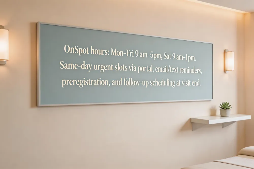 OnSpot Dermatology operates Monday‑Friday from 9 a.m. to 5 p.m. and Saturday from 9 a.m. to 1 p.m. Patients can schedule appointments by calling 941‑444‑0011 or, the online patient portal, which also provides same‑day slots for urgent concerns. Mobile clinics run typically between 7:30 a.m. and 3:30 p.m., with exact times varying by location and event. After booking, patients receive email and text reminders plus a preregistration form to speed check‑in. Follow‑up visits are arranged at the end of the initial appointment, ranging from one month to a year based on the provider’s recommendation, ensuring ongoing, personalized skin care.