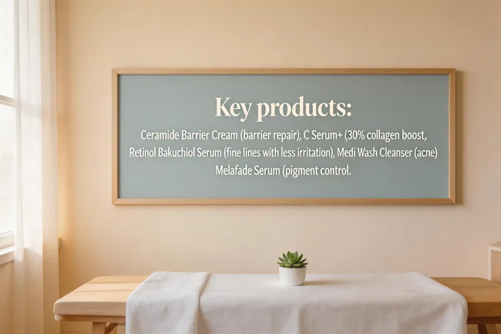Derma Made’s Ceramide Barrier Cream blends ceramide NP and hyaluronic acid to restore the lipid barrier and lock in moisture, a benefit confirmed in barrier‑repair studies. Antioxidant C Serum+ supplies stabilized L‑ascorbic acid for collagen‑stimulating and photoprotective effects, with studies showing up to 30 % collagen increase after eight weeks. The Retinol Bakuchiol 0.5 Serum pairs 0.3 % retinol with bakuchiol, improving fine lines while reducing irritation, a synergy proven in trials. Medi Wash Cleanser uses colloidal sulfur and salicylic acid for oil‑reducing and antimicrobial action, for acne‑prone skin. Melafade Serum contains tranexamic acid, kojic acid and hexylresorcinol to curb melanin synthesis, proven for melasma and hyperpigmentation.