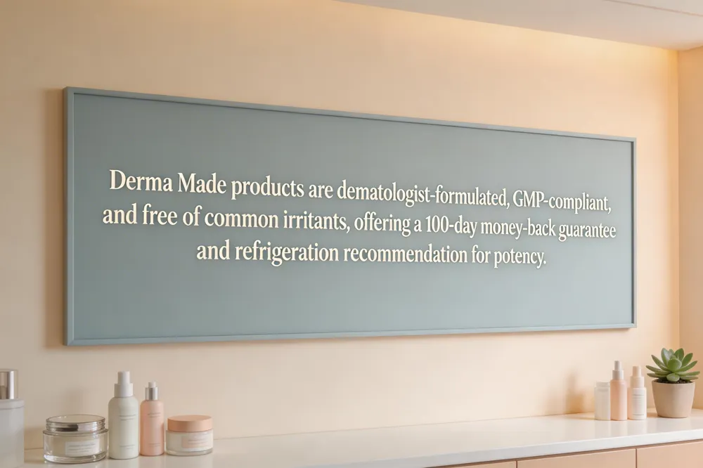 All Derma Made products are formulated under the supervision of board‑certified dermatologists, adhering to Good Manufacturing Practices and free of common irritants such as fragrance, parabens, and sulfates. The brand conducts third‑party stability and safety testing, offers a 100‑day full money‑back guarantee, and recommends refrigeration after opening to preserve potency. This rigorous safety protocol ensures that the products are suitable for a broad range of skin types, including sensitive and post‑procedure skin, providing patients with confidence in their daily regimen.