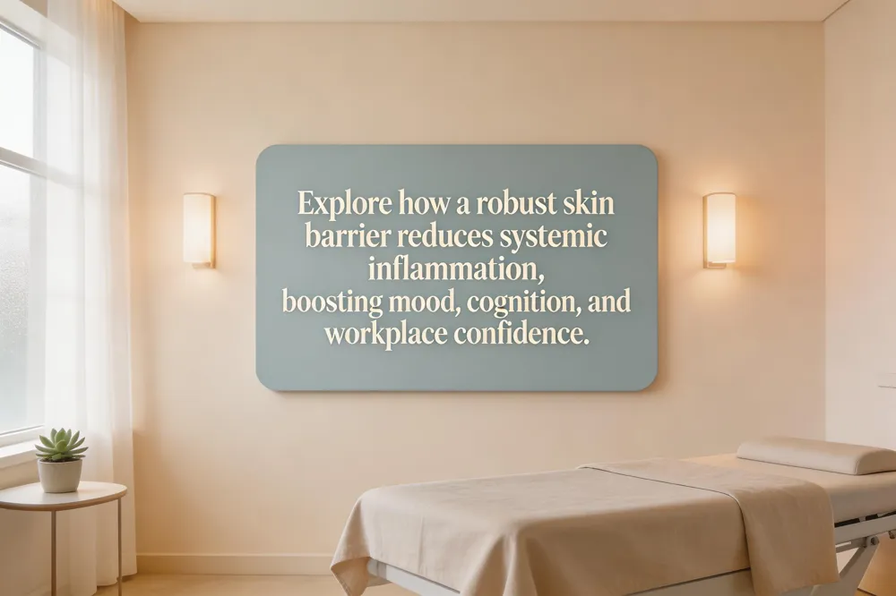 A healthy skin barrier does more than protect against external irritants; it also regulates systemic inflammation that influences mood, cognition, and stress resilience. Restoring stratum corneum hydration and epidermal integrity lowers circulating pro‑inflammatory cytokines, which research links to reduced anxiety and depressive symptoms (Zhu et al., 2025). This physiological benefit translates into clearer thinking and greater confidence in professional settings.