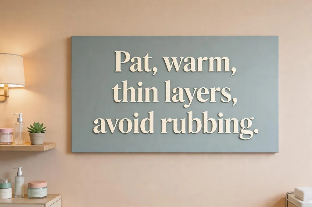 Pat the product into the skin with your fingertips or a damp makeup sponge; avoid vigorous rubbing, which can clump the zinc‑oxide or titanium‑dioxide particles and accentuate the white cast.