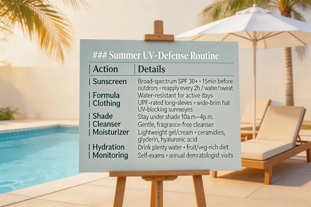 | Protecting your skin in summer starts with diligent UV defense. Apply a broad‑spectrum sunscreen with SPF 30 or higher to every exposed area least 15 minutes before heading outdoors and reapply every two hours—or sooner after swimming, sweating, or toweling. Choose water‑resistant formulas for active days. Complement sunscreen with protective clothing: a wide‑brimmed hat, UV‑blocking sunglasses, and a tightly woven long‑sleeved shirts or UPF‑rated garments. Seek shade whenever possible, especially between 10 a.m. and 4 p.m., when UV intensity peaks; remember clouds do not block UV rays. Keep the skin barrier strong by using a gentle, fragrance‑free cleanser and a lightweight moisturizer containing barrier‑supporting ingredients such as ceramides, glycerin, or hyaluronic acid. Stay well‑hydrated and support skin from within with a diet rich in fruits, vegetables, and water. Regular self‑examinations and annual dermatologist visits are essential for early detection of sun‑related changes. Together, these steps—sunscreen, re‑application, protective apparel, shade, and antioxidant‑rich moisturizers—provide a comprehensive summer skin‑care plan. |
