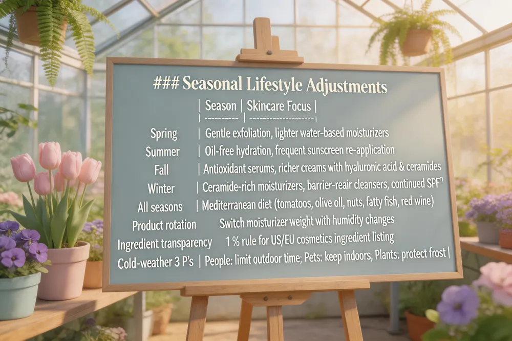 Seasonal product rotation – Switch to lighter, water‑based moisturizers and broad‑spectrum SPF 30+ in spring and summer, then transition back to richer, lipid‑rich creams with hyaluronic acid and ceramides in fall and winter to maintain barrier function as humidity drops.