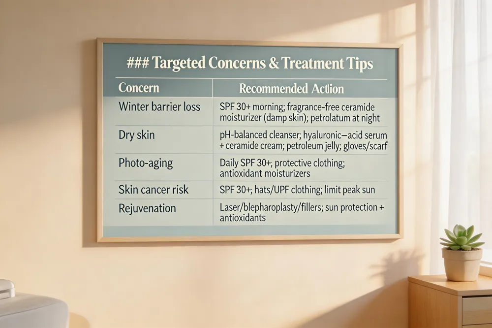 Winter skin problems and solutions: Dryness, flakiness and irritation can aggravate eczema, psoriasis or rosacea. Restore barrier function with ceramide‑rich moisturizers, avoid harsh soaps, and consider prescription barrier‑repair creams under dermatologist guidance.