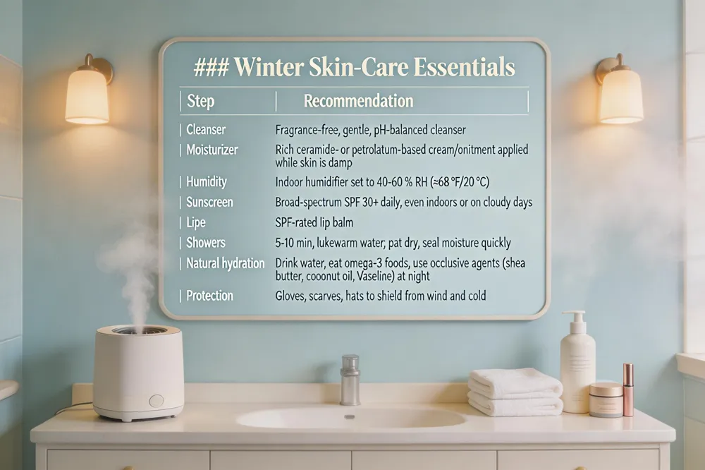 | Winter skin care tips by dermatologists: Use a fragrance‑free, gentle cleanser and follow immediately with a rich, ceramide‑ or petrolatum‑based moisturizer while skin is still damp. Choose creams or ointments over lightweight lotions, especially for hands, feet and very dry areas. A home humidifier set to 40‑60 % humidity counteracts indoor heating and reduces transepidermal water loss. Apply broad‑spectrum SPF 30+ sunscreen daily, even on cloudy days, and protect lips with an SPF‑rated balm. Limit showers to 5‑10 minutes with lukewarm water; pat dry and seal moisture quickly. |