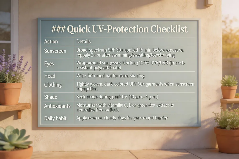 | UV protection for skin means using a layered defense that blocks or limits exposure to UVA and UVB rays, which cause sunburn, premature aging, and skin cancer. Apply a broad‑spectrum sunscreen with SPF 30 or higher at least 15 minutes before going outdoors and reapply every two hours, or sooner after swimming, sweating, or towel‑drying. For the eyes, choose wrap‑around sunglasses that block 100 % of UVA and UVB rays, preferably with impact‑resistant polycarbonate lenses, and pair them with a wide‑brimmed hat for extra shielding. When sunscreen isn’t practical, wear tightly woven, dark‑colored clothing rated UPF 50 or higher, cover as much skin as possible, and seek shade during peak UV hours (10 a.m.–4 p.m.). Antioxidant‑rich moisturizers containing vitamins C, E, or green‑tea extract can help neutralize any residual UV‑induced free radicals. Consistent daily use of these measures, even on cloudy days creates a comprehensive, year‑round barrier that protects both skin and eyes from cumulative UV damage. |